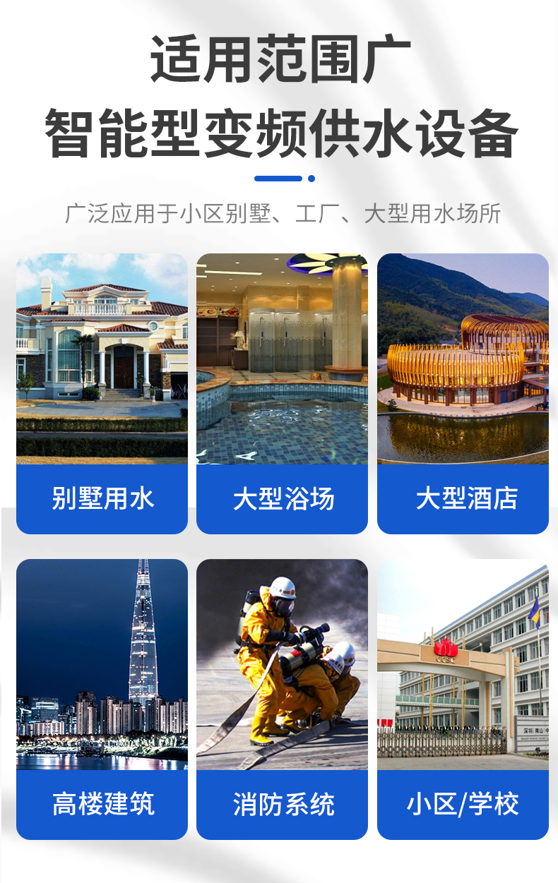 民用建筑領(lǐng)域:在新建的住宅小區(qū)、別墅、寫(xiě)字樓、綜合樓、高層建筑、賓館飯店等民用建筑中,恒壓變頻供水設(shè)備得到了廣泛應(yīng)用。它為居民和用戶(hù)提供了穩(wěn)定可靠的生活用水,保障了日常生活的正常進(jìn)行。無(wú)論是高層住宅的水壓不足問(wèn)題,還是大型商業(yè)建筑復(fù)雜的用水需求,恒壓變頻供水設(shè)備都能輕松應(yīng)對(duì),確保每一位用戶(hù)都能享受到舒適、便捷的用水服務(wù)。