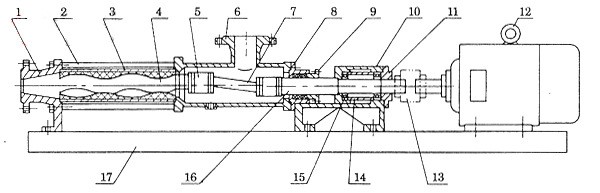 G型單螺桿泵是按迥轉(zhuǎn)嚙合容積式原理工作的新型泵種。主要工作部件是偏心螺桿(轉(zhuǎn)子)和固定的襯套(定子)。由于該部件的特殊幾何開(kāi)頭分別形成單獨(dú)的密封容腔。介質(zhì)由軸向均勻推行流動(dòng)。內(nèi)部流速代低,容積保持 不變。壓力穩(wěn)定,因而不會(huì)產(chǎn)品渦流和攪動(dòng)。 單螺桿泵被廣泛用于各行業(yè)輸送各類(lèi)介質(zhì),恒壓連續(xù)運(yùn)行,無(wú)脈動(dòng),介質(zhì)輸送無(wú)破損,通過(guò)調(diào)節(jié)轉(zhuǎn)速改變流量從而達(dá)到計(jì)量的目的。本產(chǎn)品適合輸送具有以下特性的介質(zhì):固體含量高(最大粒徑可達(dá)150mm)或無(wú)固體含量|各種粘度(1mPas-3百萬(wàn)mPas)的介質(zhì).觸變性和易膨脹性介質(zhì).剪切敏感性介質(zhì).磨蝕性介質(zhì).有/無(wú)自潤(rùn)滑性的介質(zhì)|腐蝕性介質(zhì)(pH=O-14).粘結(jié)性介質(zhì).有毒性介質(zhì).流量大、壓力高.流量范圍從每小時(shí)幾毫升到500m3(2200gpm).壓力范圍最高可達(dá)48bar,特殊設(shè)計(jì)可達(dá)72bar。同一種傳動(dòng)部件可與四種不同設(shè)計(jì)的轉(zhuǎn)子/定子匹配,為您提供使用方案。 針對(duì)不同的應(yīng)用領(lǐng)域,選用不同的金屬材料,從鑄鐵、鎳鉻鋼到耐酸材料、哈氏合金及鈦合金。彈性材料可選用耐磨的、耐油的、耐酸的、耐堿的橡膠,如天然橡膠、丁晴橡膠、乙丙橡膠及氟橡膠等。對(duì)磨蝕性強(qiáng)的介質(zhì),可選用陶瓷或塑料。當(dāng)介質(zhì)因高溫或含有某些化學(xué)成分而不能選用彈性材料時(shí),可選用硬材質(zhì)定子或剛性定子。各種軸封形式:按客戶(hù)的要求,機(jī)械密封從單端面機(jī)封(帶或不帶急冶)、雙端面機(jī)封(背靠背式及串聯(lián)式機(jī)械密封)到盒式密封;也可選用填料密封、水封環(huán)及特殊密封。對(duì)有毒介質(zhì)可提供無(wú)泄漏磁力傳動(dòng)。 G型單螺桿泵結(jié)構(gòu)圖: